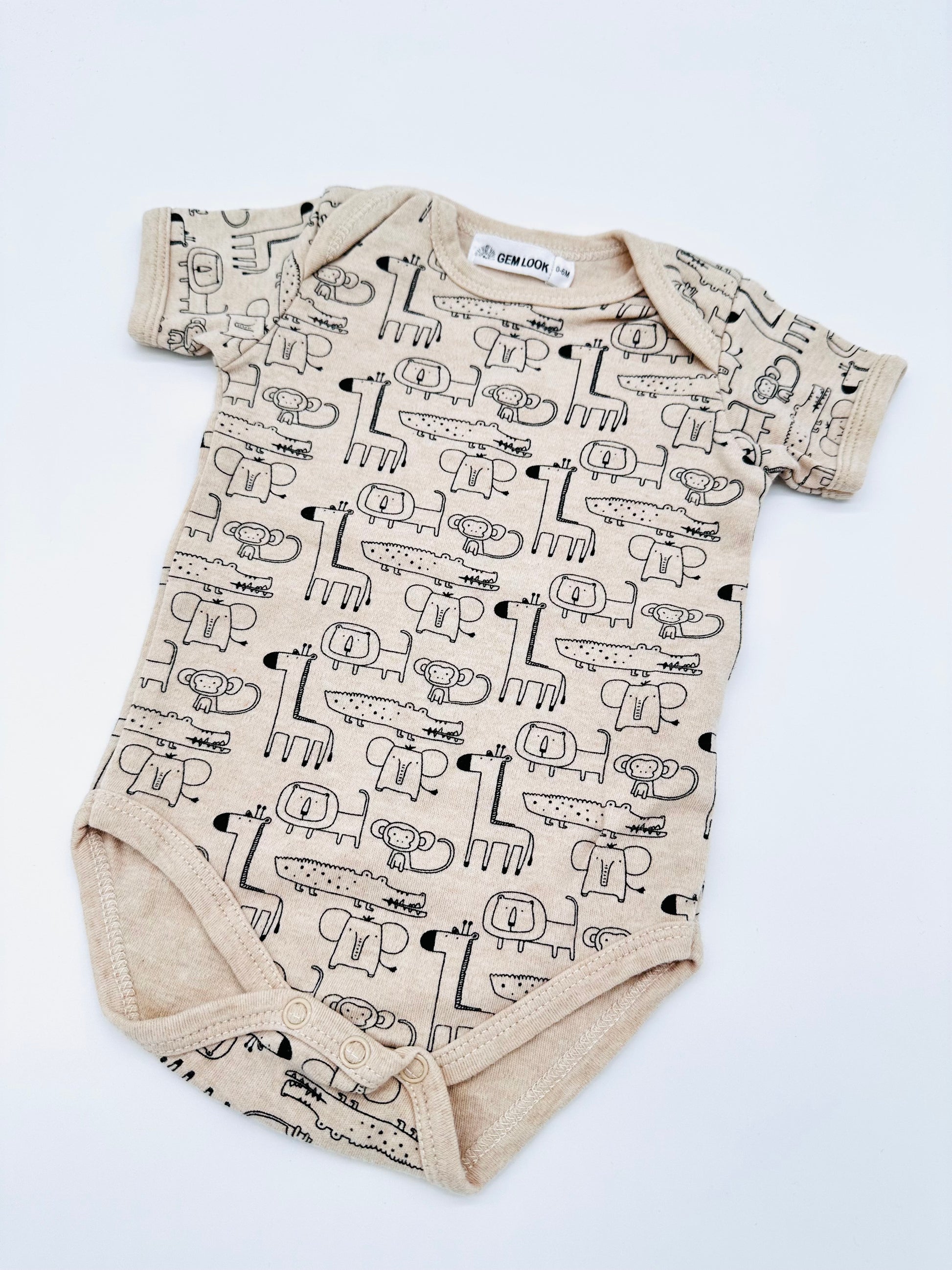 Ein niedlicher Kurzarm-Body von Gem Look im trendigen Naturton mit Tier-Alloverprint 🦁🐘🐊🦒🐵. Perfekt für kleine Entdecker – bequem, süß und praktisch zugleich.