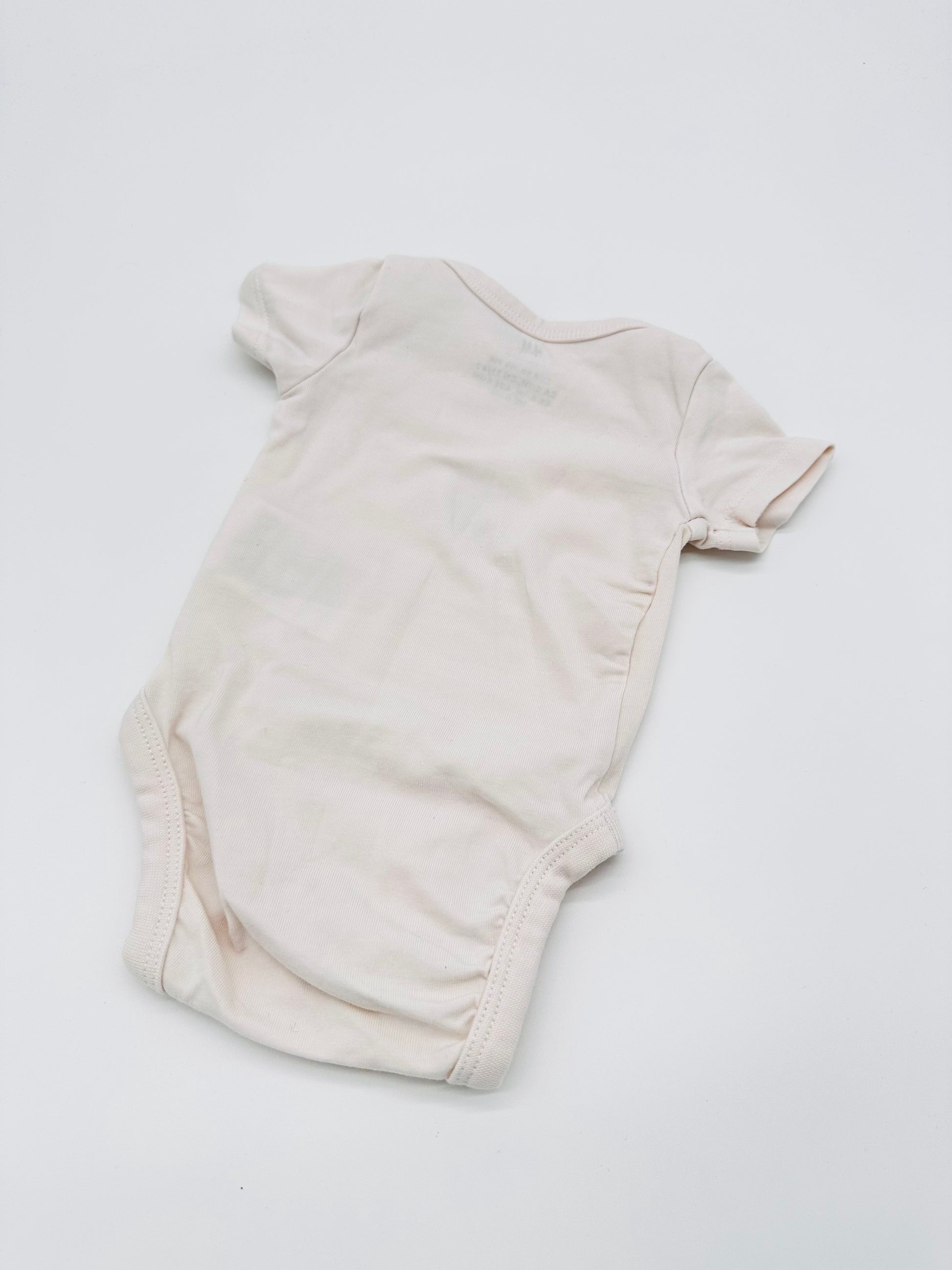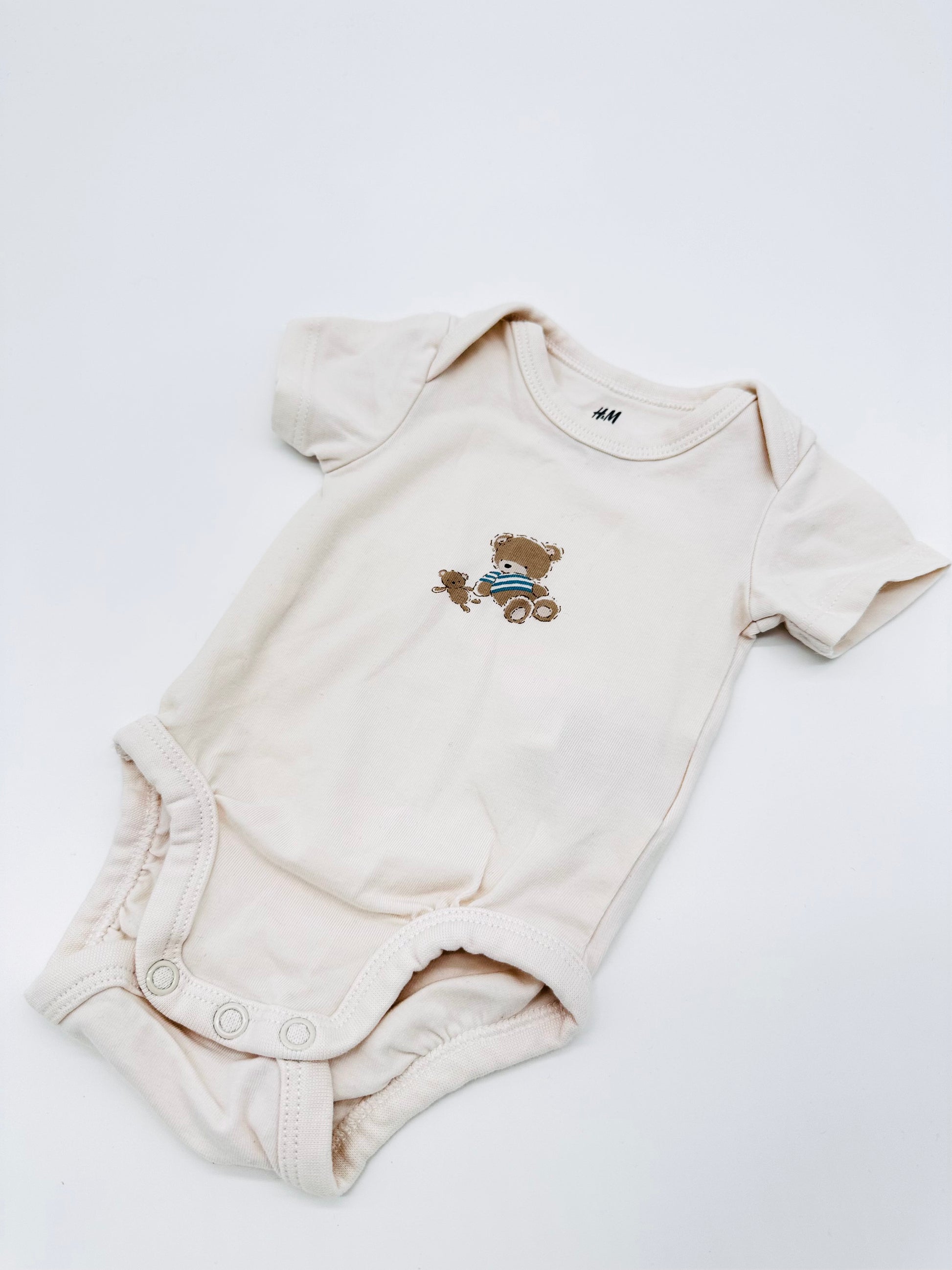 Dieser süße Kurzarm-Body von H&M in zartem Cremeweiß begeistert mit einem niedlichen Teddy-Motiv und besonders weichem Material. Dank Elasthan-Anteil sitzt er angenehm und bietet deinem Baby volle Bewegungsfreiheit – ideal für die ersten Wochen zu Hause oder unterwegs. Praktische Druckknöpfe im Windelbereich erleichtern das An- und Ausziehen.