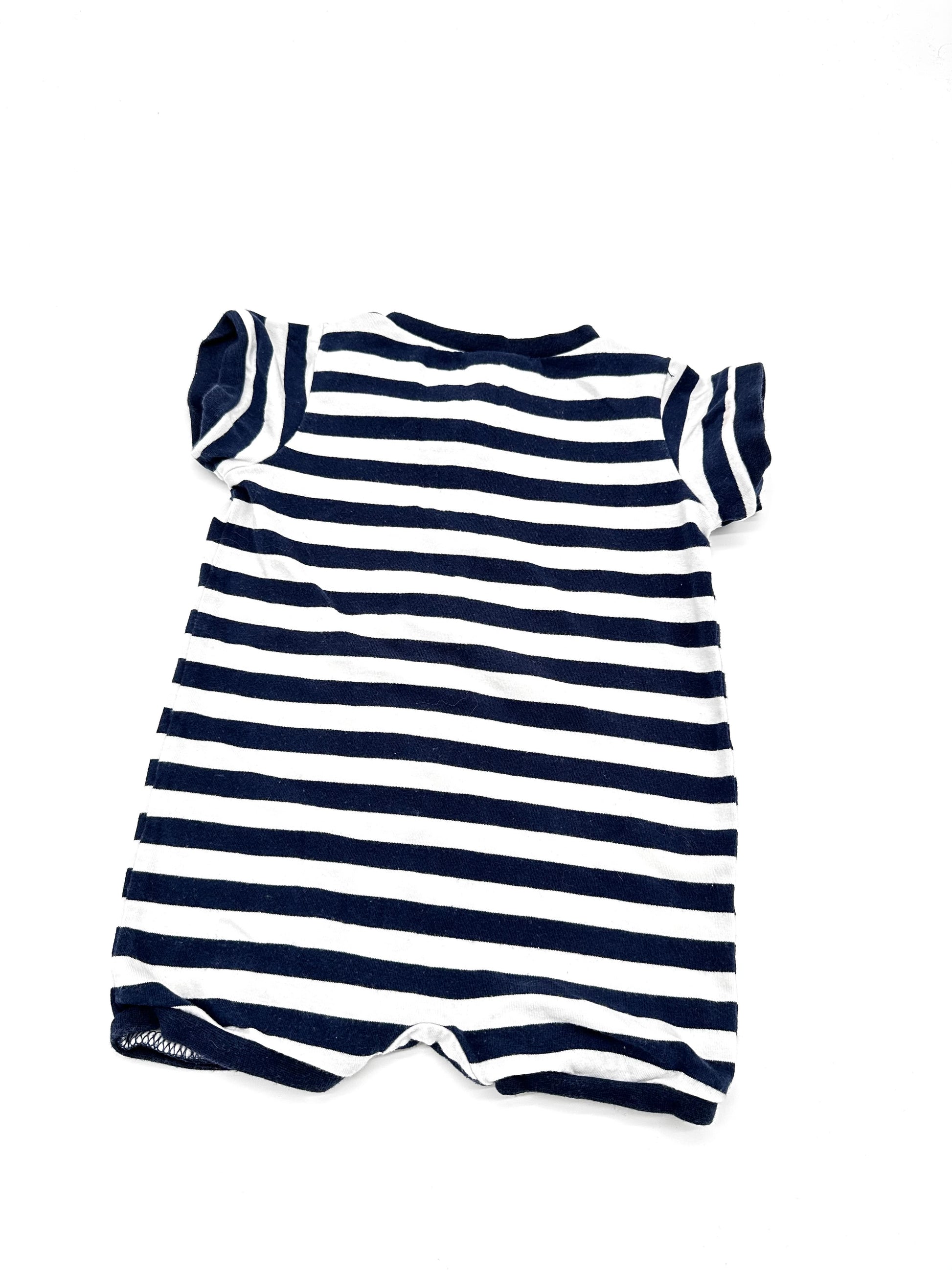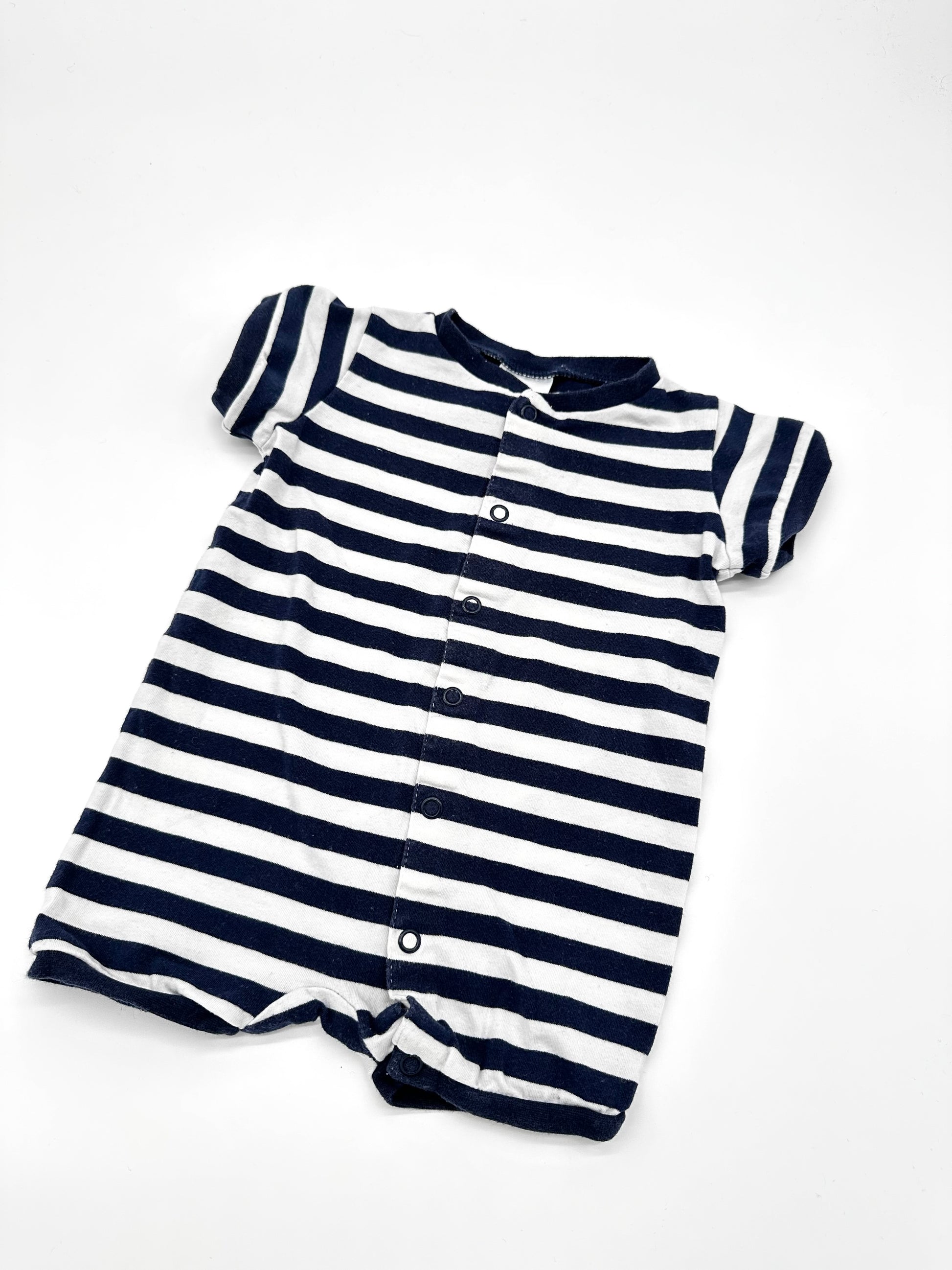 Praktisch, bequem und süß – dieser gestreifte Kurzarm-Overall von H&M ist ein tolles Basic für den Sommer. Das klassische Marine-Design in Dunkelblau-Weiß wirkt zeitlos und lässt sich vielseitig kombinieren. Durch die durchgehende Knopfleiste auf der Vorderseite ist das An- und Ausziehen sowie Wickeln besonders unkompliziert.
