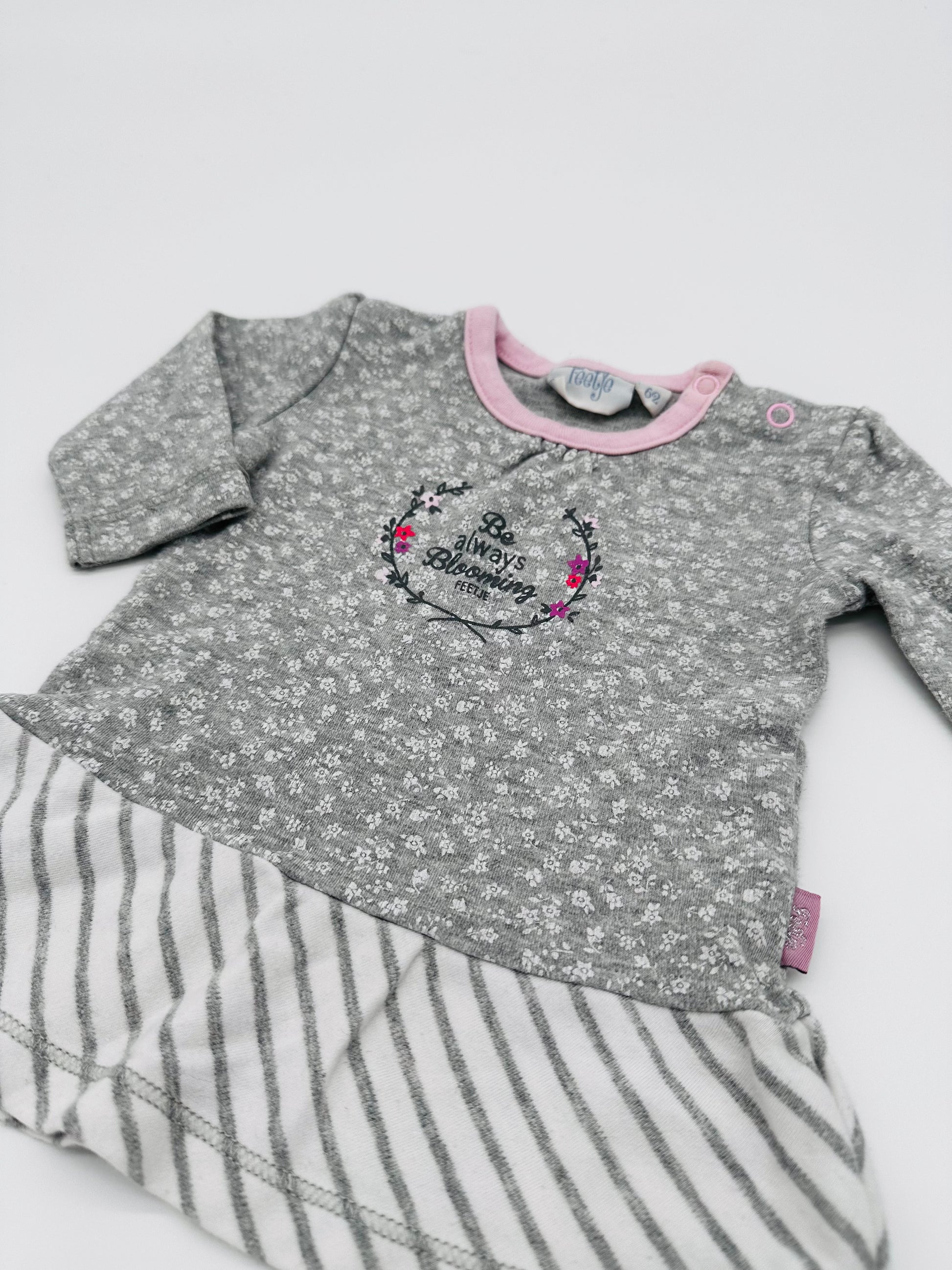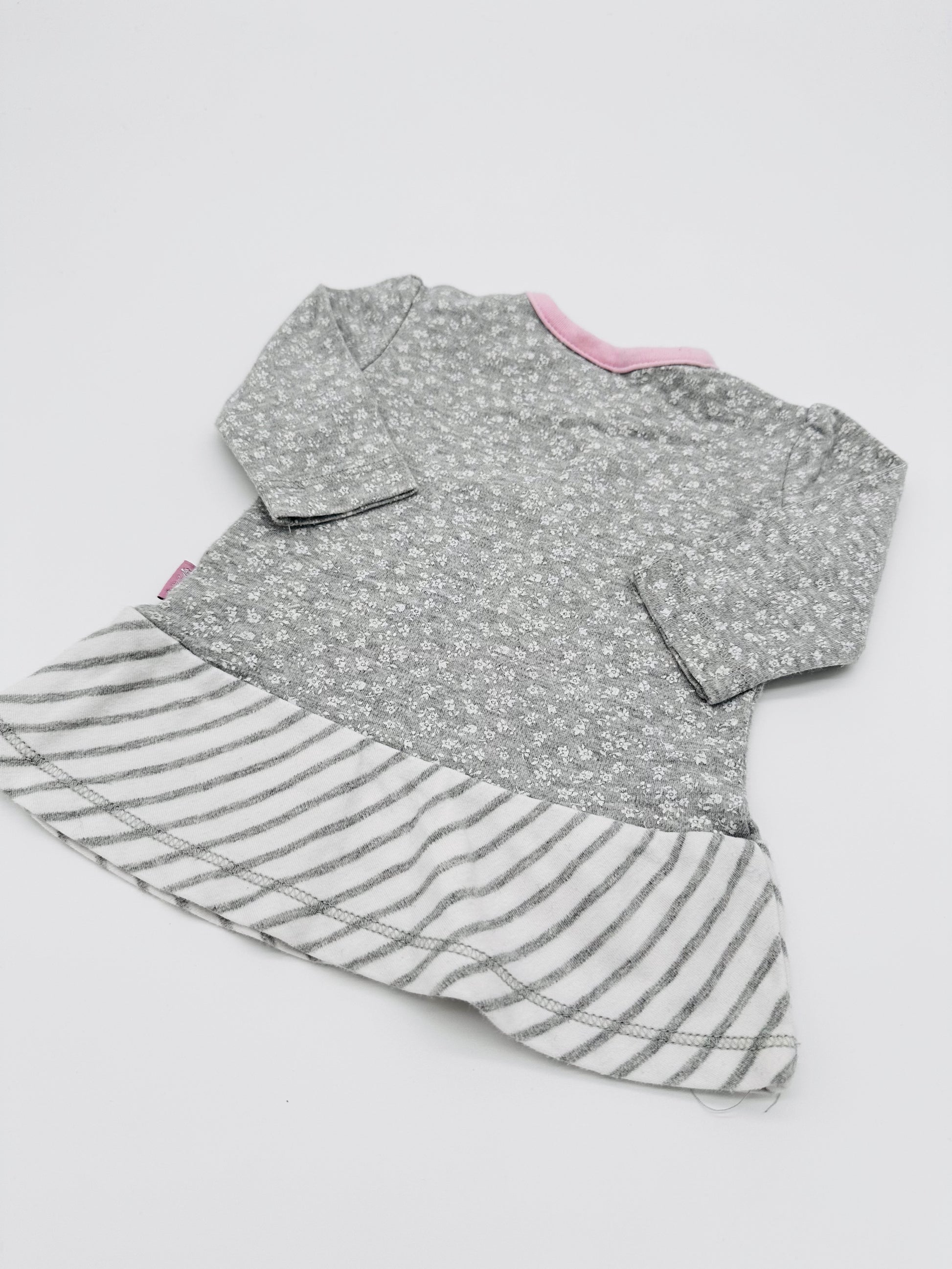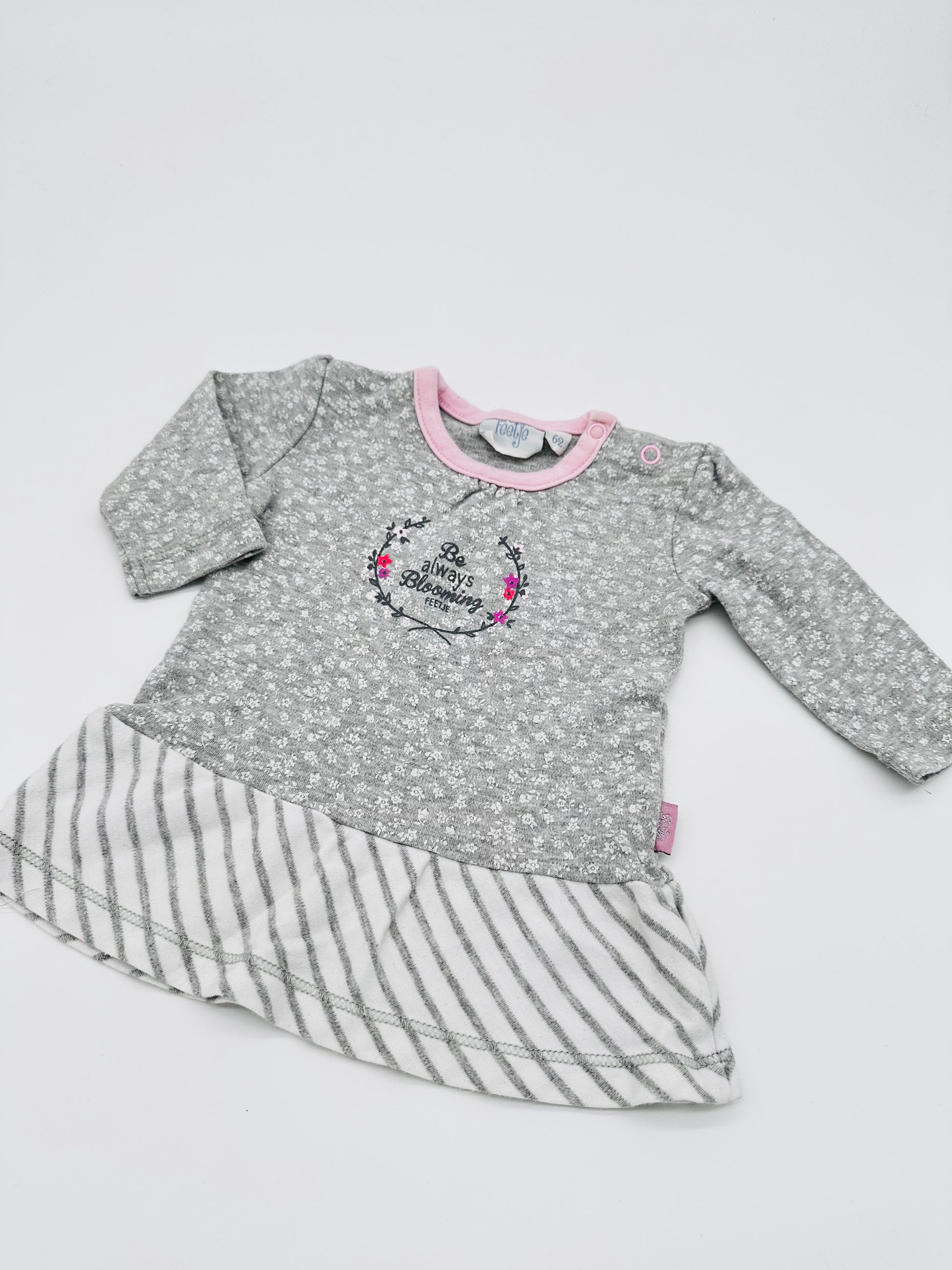 Dieses bezaubernde Kleid von Feetje kombiniert Komfort und Stil auf wunderschöne Weise. Das graue Oberteil mit zarten Blümchen und der liebevolle Print „Be always blooming“ mit kleinen Blüten machen es zu einem echten Hingucker. Der gestreifte Rockteil bringt zusätzlich verspielte Leichtigkeit in das Outfit, während der rosa abgesetzte Halsausschnitt für einen süßen Farbakzent sorgt.