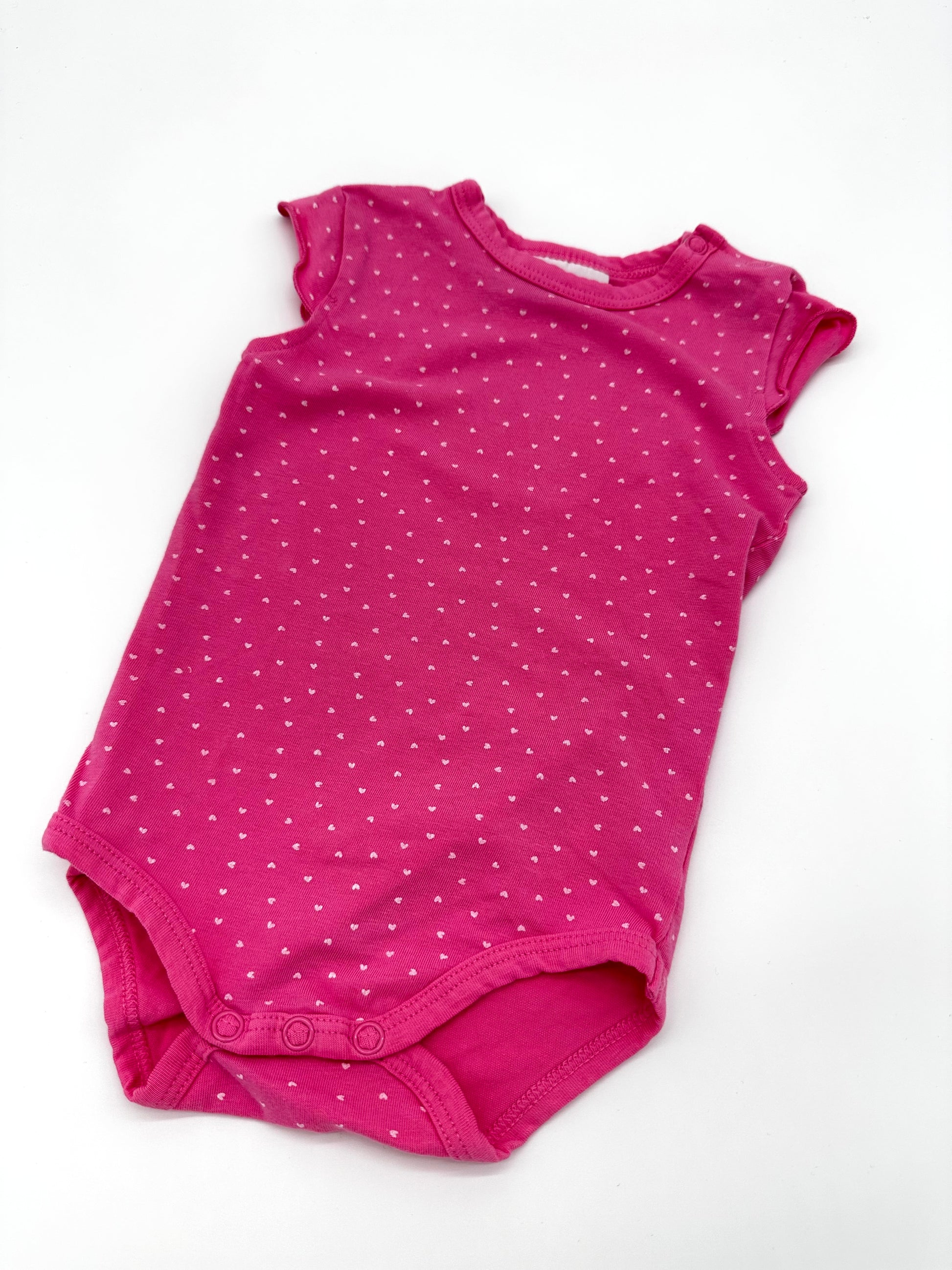 Süßer Kurzarm-Body von Topomini in kräftigem Pink mit zartem weißen Herzchenmuster. Ein echter Hingucker, der gleichzeitig bequem und praktisch ist. Die kleinen Flügelärmel geben dem Body einen besonders niedlichen Look.