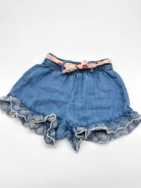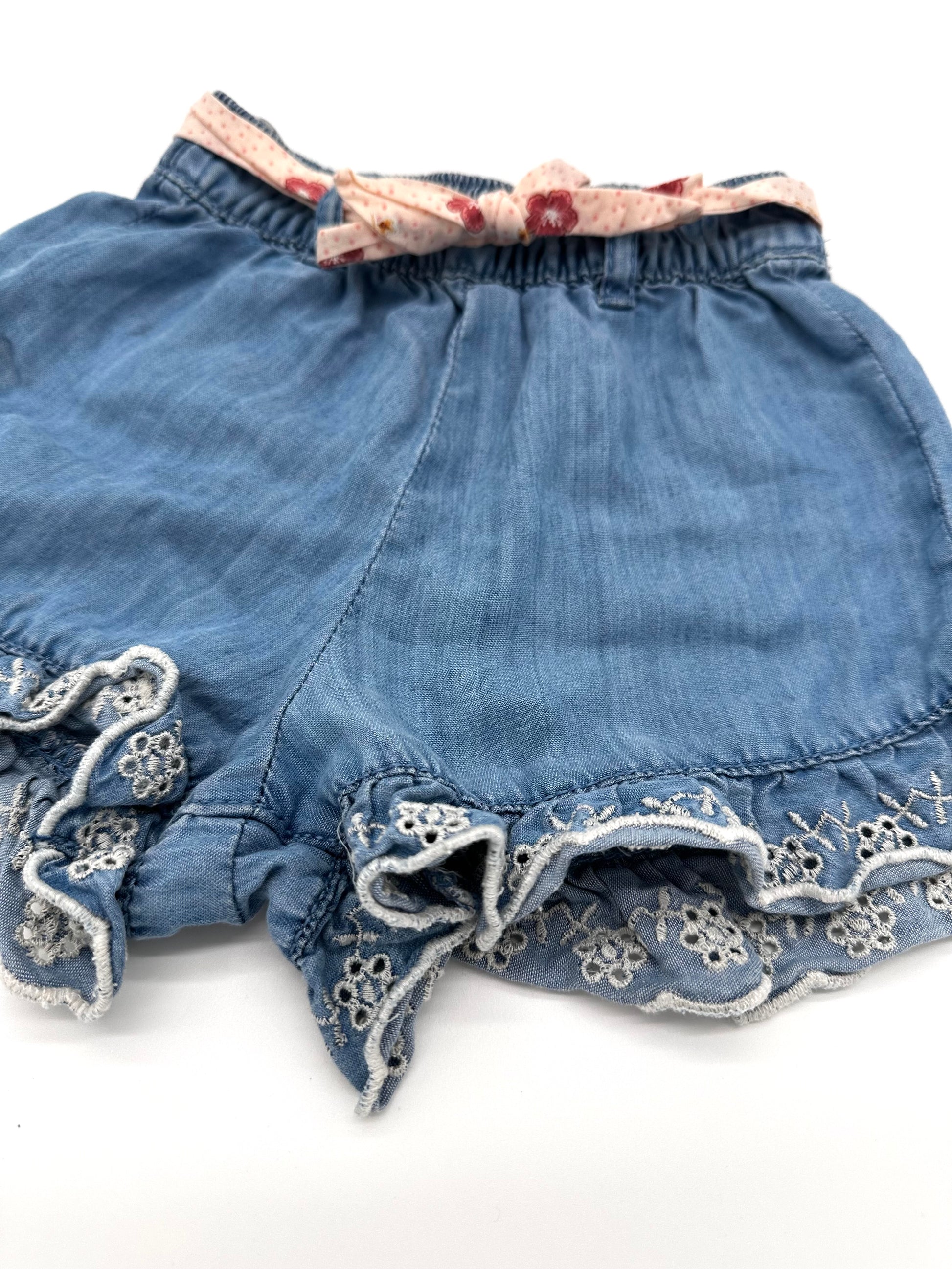 Die zarte Spitzenverzierung am Saum verleiht der Hose einen verspielten Look, während das schmale Bindeband in Rosa mit Blümchenmuster für einen hübschen Farbakzent sorgt. Der elastische Bund macht die Shorts außerdem super bequem und praktisch im Alltag.