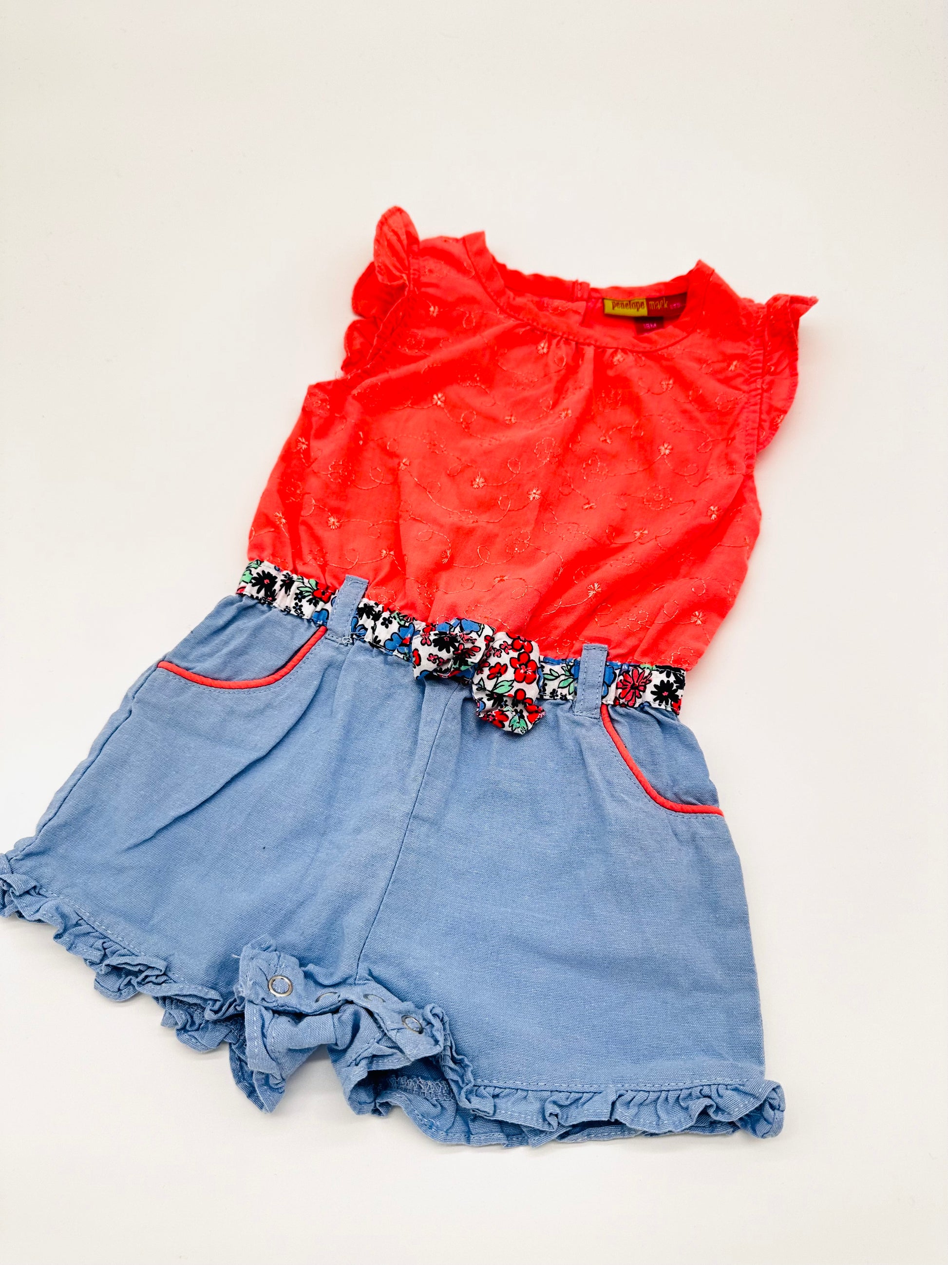 Ein absoluter Sommer-Liebling! Dieser süße Overall von Penelope Mack kombiniert einen leuchtend roten Oberteil mit dezenten Stickereien und eine hellblaue Shorts mit verspielten Rüschen. Der blumige Gürtel setzt einen besonderen Akzent und macht das Outfit zu einem echten Hingucker.