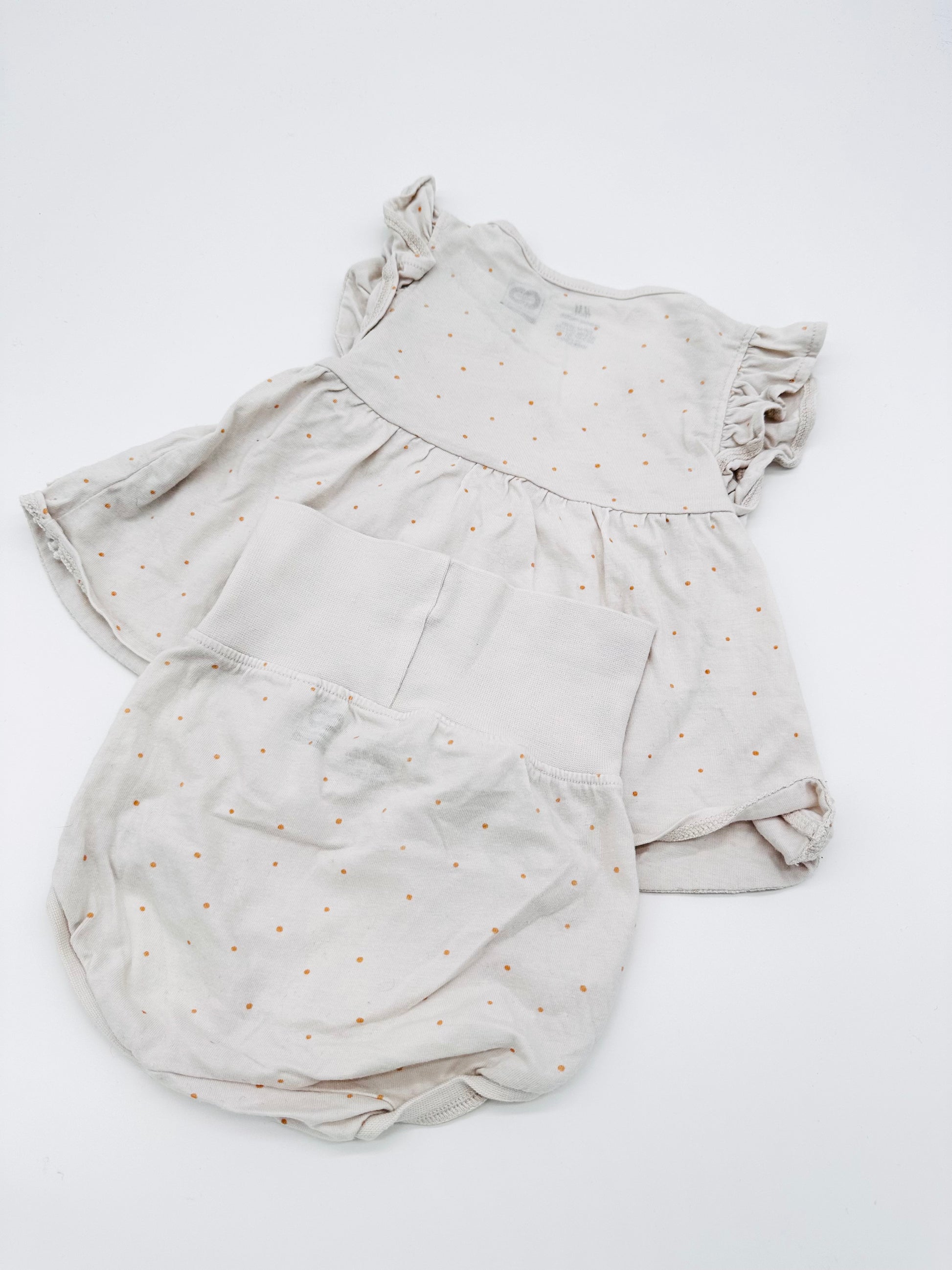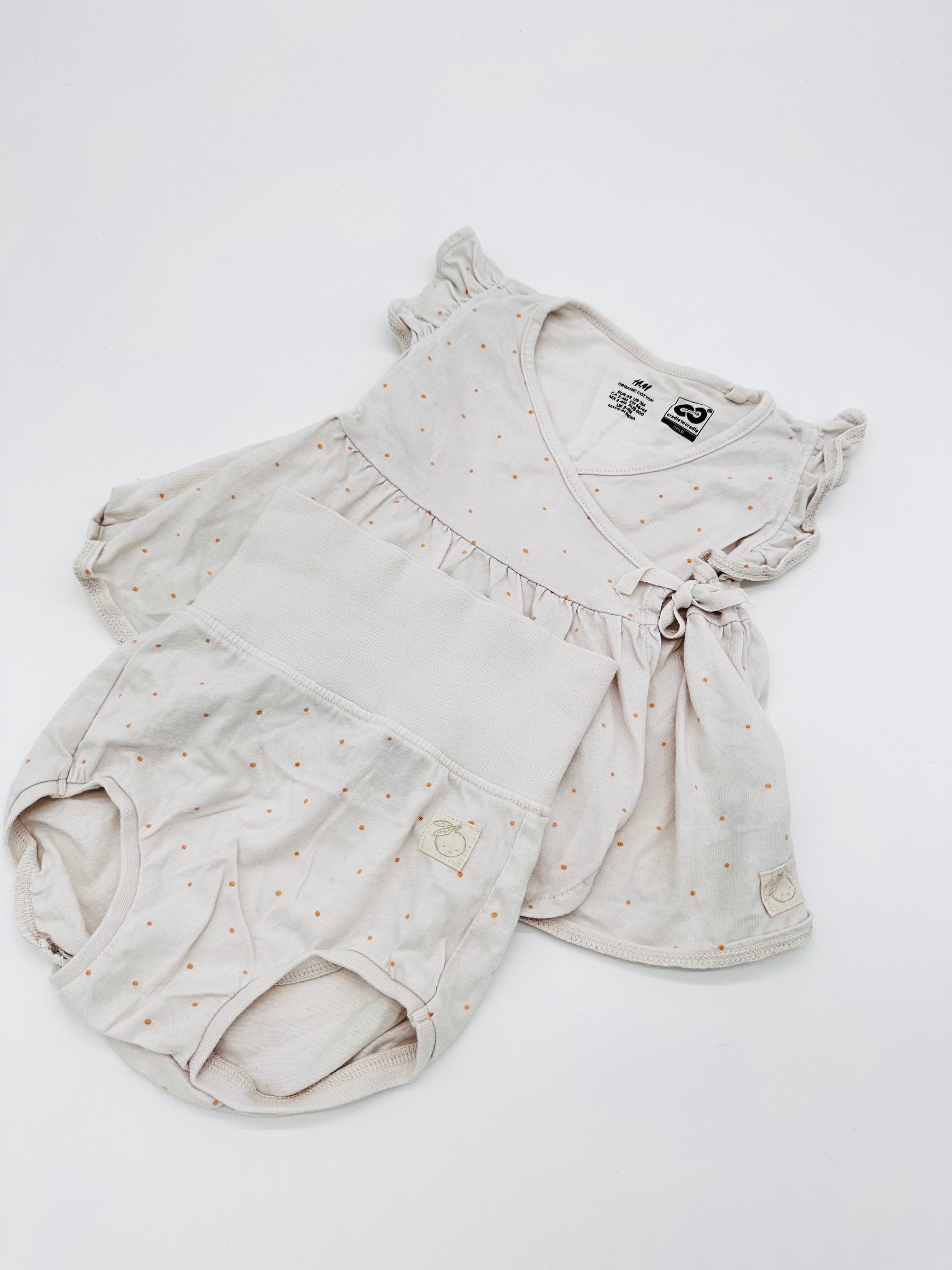 Dieses zarte Set in Größe 68 von H&M besteht aus einem süßen Wickelshirt mit feinem Pünktchenmuster und einer passenden Bloomer-Hose. Aus weichem Baumwollmaterial gefertigt, sorgt es für höchsten Tragekomfort – perfekt für warme Tage oder als bequeme Homewear.